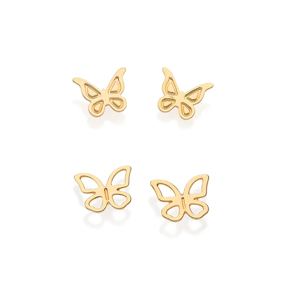 Kit brinco com 2 pares formato borboleta, sendo 1 par vazado e outro em baixo relevo.